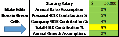 - Annual Growth Assumption – Put in your assumed 401K return. Average S&P return since 1950 is 11%. I used 8% to be safe, but you can use whatever you feel comfortable with.