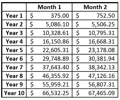 As you can see, your first month you would have $375 (9% total match*$50,000 salary/12 months = $375). Month two, you are adding another $375 plus you’re earning .67% (8% interest/12 months = .67% interest monthly) interest on your $375 from month one, so on and so forth.