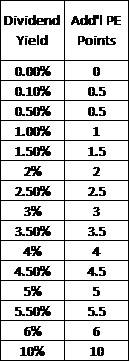 In the model, every percentage of dividend yield equals one percentage point. That contrasts with the non-linear relationship of growth to PE, and if the dividend yield is less than 1 percent, it receives 0.5 points.