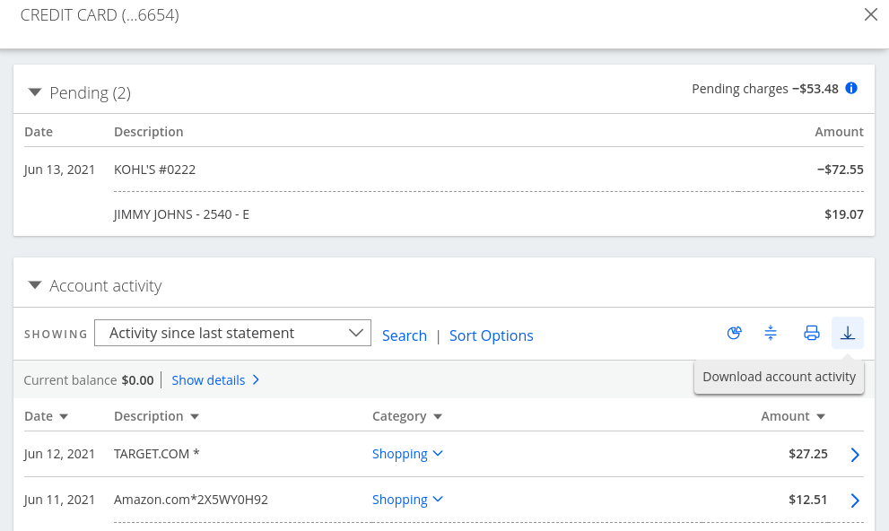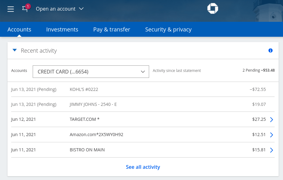 After I login to the Chase account, I select the credit card and land on the screen below: