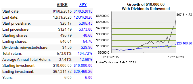 I chose to work smart, not hard, and now you can see the results of comparing $10K invested in SPY and ARKK below: