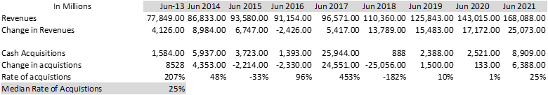 In Microsoft’s case, Satya Nadella took charge in 2014, and you can see that R&D as a percentage of sales started to increase, but we also see acquisitions start to increase, including the purchase of LinkedIn in 2017. And as time has passed, that purchase is starting to bear fruit for the company. Typically, acquisitions take time to gain traction, especially revenue synergies.
