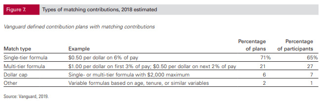 Below shows the most common types of matching with by far, the most common being 50% for every percent up to 6%, meaning your employer would match 3% if you put in 6%: