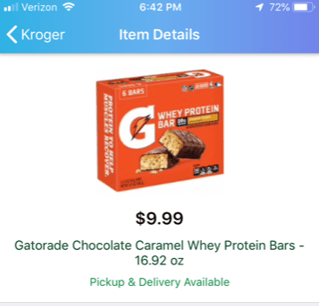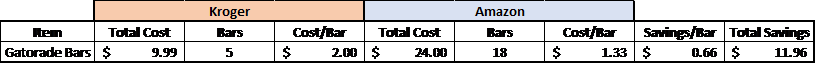 To ensure this was an apples-to-apples comparison, I ensured the serving size was the same. For instance, with the Gatorade Bars, since the largest unit between Amazon and Kroger was 18 bars, I multiplied the cost/bar of the lower item supplier by 18.