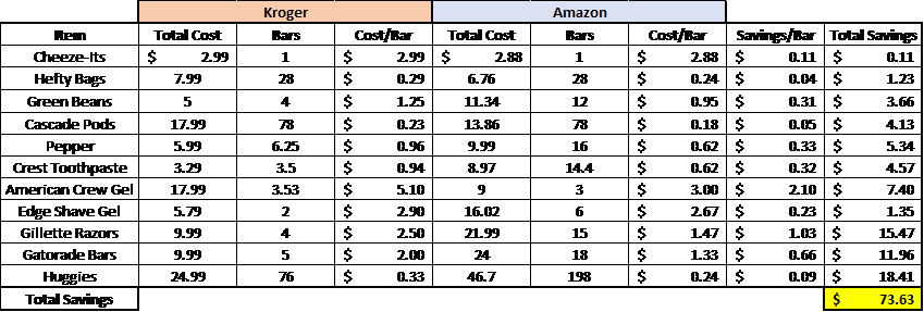 So, in other words, if I bought 18 Gatorade bars at Kroger, I would have spent a total of $11.96 more than I would have through Amazon. Below, I made that same comparison for all products.