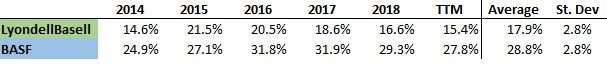 For an example of what lower and more volatile COGS looks like, let’s take a look at the competitive chemicals industry with LyondellBasell and BASF. As exemplified through their high gross margins averaging 17.9% and 28.8%, respectively, over the past 5 years the industry is competitive with dozens of major competitors producing the same of similar products. The fact that BASF has higher gross margins may be indicative of the company selling more specialized chemical products.