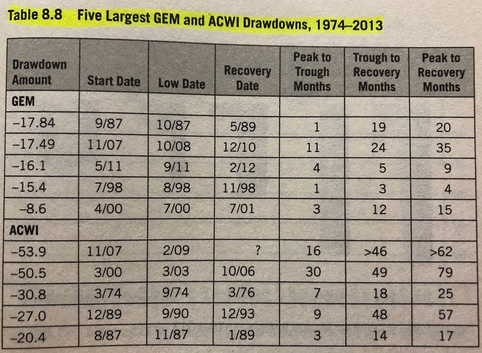 As you can see, the worst years for GEM aren’t even in the top 5 worst years for the ACWI (stock market index), meaning that the lows are much higher for GEM.