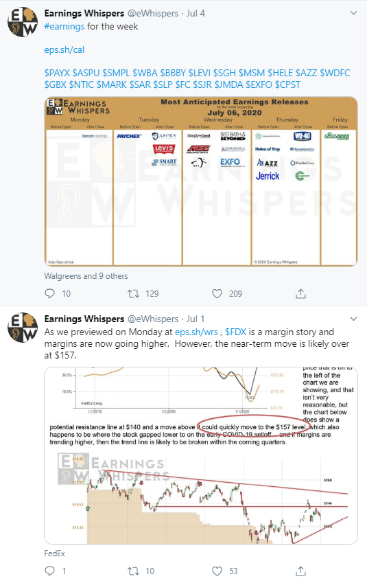 The next account that I like a lot is Earnings Whispers (@ewhispers). Earnings Whispers gives great information leading up to earnings calls and while I will never make a decision to buy or sell a stock solely based off the quarterly earnings of a company, I definitely do pay attention to those earnings.