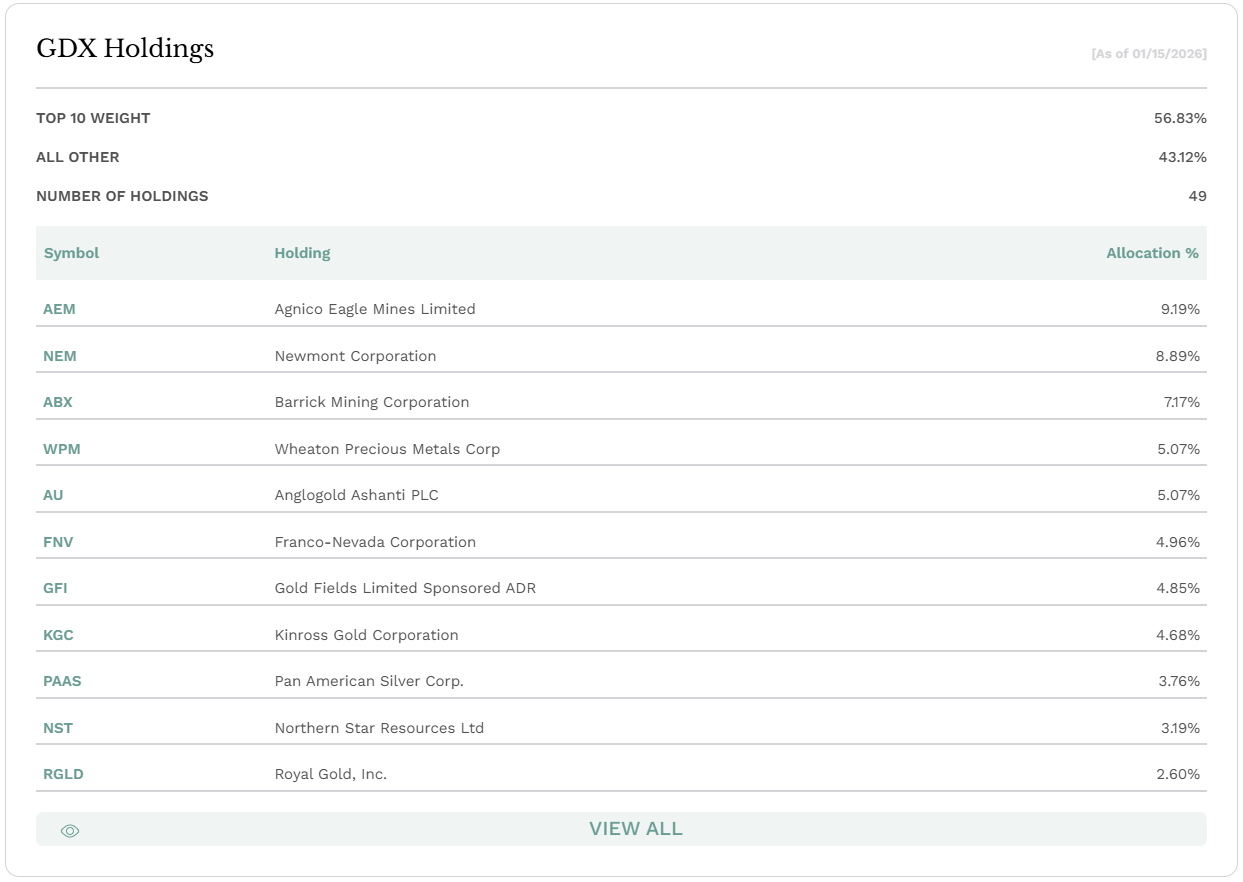 The next ETF is GDXJ, which is the Junior Gold Miners ETF. It is similar to GDX but has companies with much smaller market caps than those in GDX.