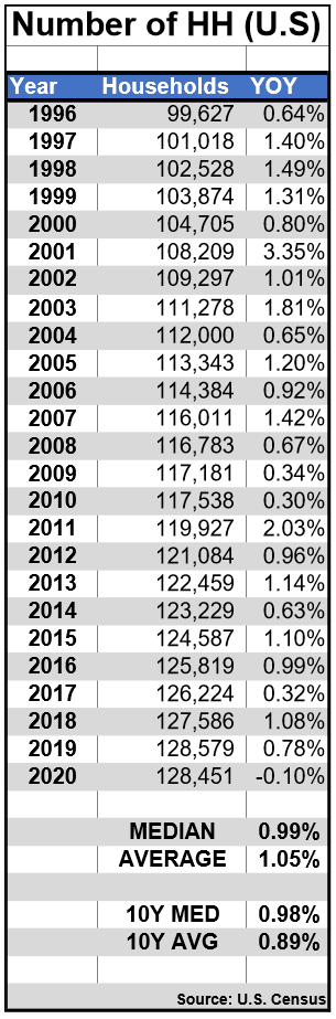 We can see that even over the last 10 years, household formation has come in close to 1% per year even with all of the negative statistics around declining birth rates.