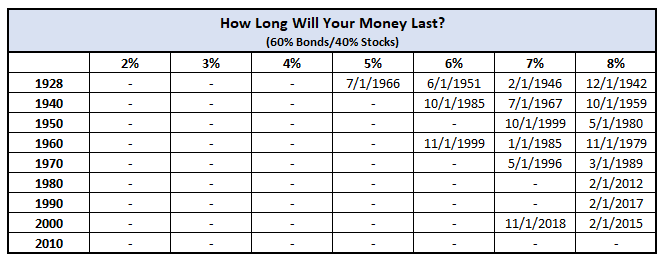 If I started in 1928, I would’ve run out pretty early as I already mentioned. But any other 10-year period I would’ve made it all the way through until today even at a 5% withdrawal rate, so taking out $50,000 annually instead of the initial plan of $40,000.