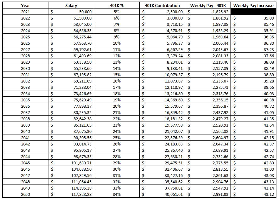 My 401K contributions grow by that same 1% each year which becomes more and more impactful as my salary increases, and I am still consistently bringing home about $40 on average more each paycheck, before taxes and all other things.