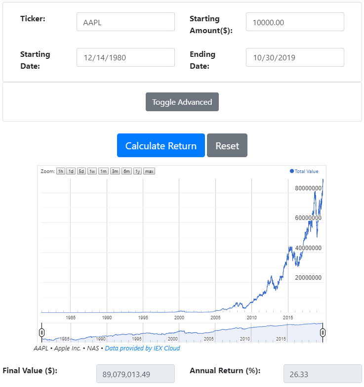 That in itself is a pretty dang good return over the last few years, but what if you had purchased the stock when it had it’s IPO in 1980? Using the DRIP calculator that I told you about above, I went back and wanted to see what a $10,000 investment would look like today…