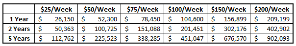 These returns are if you worked for 1/2/5 years making this much each week and then invested it for 40 years at an average CAGR of 8% (S&P 500 average has been over 11% for the last 20 years). So, in other words, working a few extra hours for 1, 2 or 5 years could really give you a HUGE opportunity to retire earlier than you might’ve been able to before. I know it’s not for everyone…. but it should at least be worth considering!