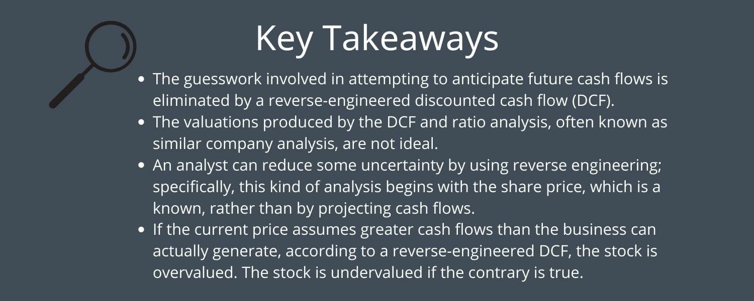 If the reverse-engineered DCF assumes more cash flows than the company can reasonably produce, then the company remains overvalued. If the opposite is true, then the company is undervalued.
