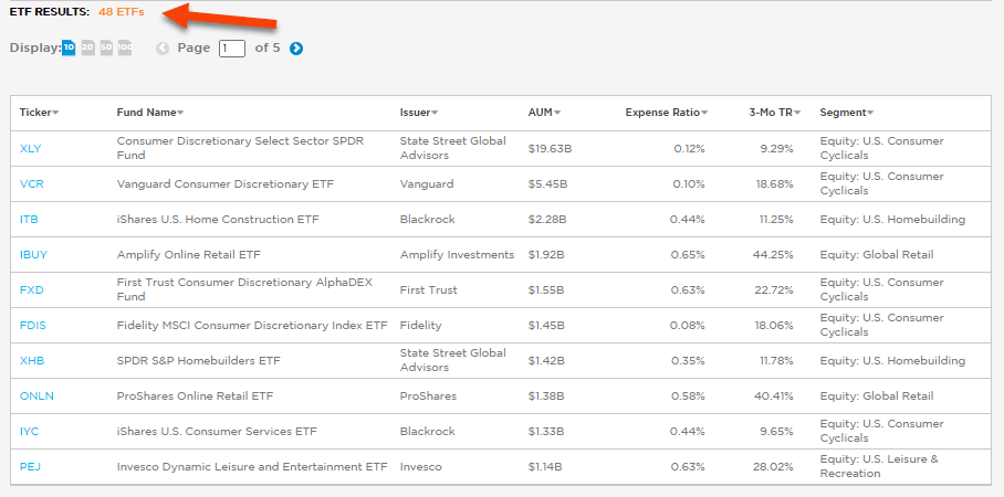 When I type “Consumer Discretionary” into the search bar, I get 48 different ETFs that would fall into this category: