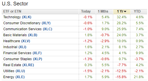 At the end of the day, there were 4 sectors that outperformed the S&P 500 while 7 underperformed. INFT, or Information Technology led the pace and essentially doubled up the S&P 500 while ENRS, the Energy sector, lost 32% of the initial investment!