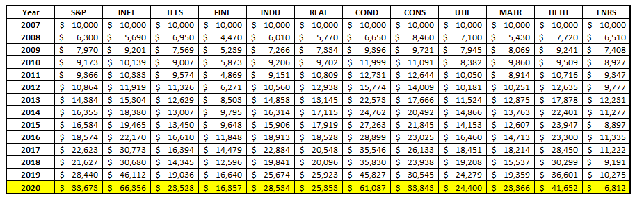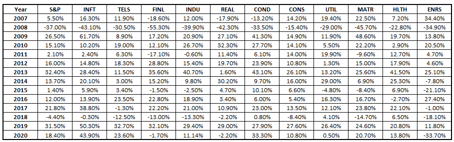 Below shows the chart of each sector by year compared to the S&P 500:
