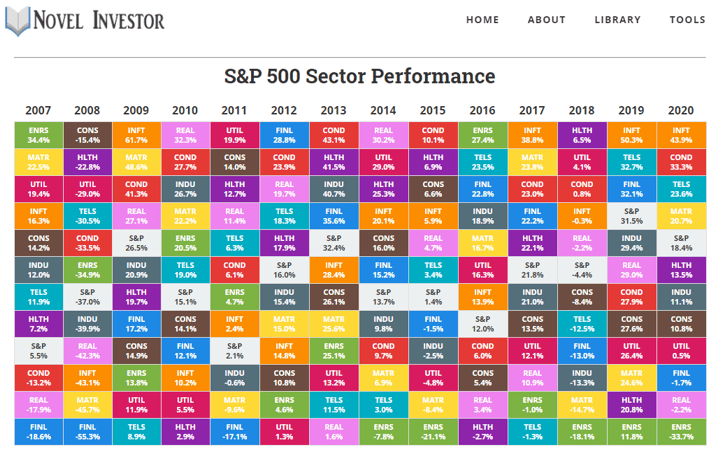 The Novel Investor has this really cool, interactive chart that shows us how the different sectors have performed since 2007, shown below: