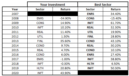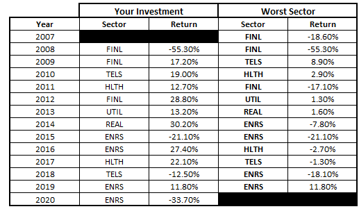 Below shows the best performing sector each year and the performance if you had invested the following year: