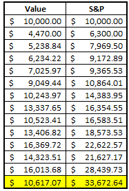 If you’d keep this up through 2020 you would end up with $10,616 – a massive underperformance vs. the S&P 500: