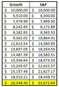 As you can see, the S&P 500 had a pretty nice return of turning that $10K into nearly $34K. Now, it’s important to note that this doesn’t include dividends whatsoever – purely price performance.