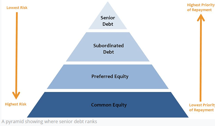 The Corporate Finance Institute put out a really good graph to show where investors, or ‘common equity’, would fall into the pecking order if a company was going to go broke. Spoiler – it’s not good! And this isn’t the bottom of the pyramid type of good like the bottom of the food pyramid is…