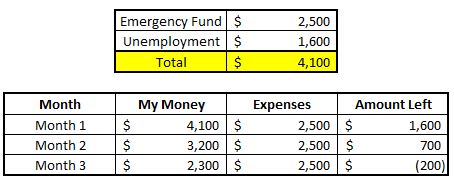 - I would file for unemployment. So, I would only need the $2500 to cover me until I got that money, which is usually about half of your income and capped around $500-$600/week, based off your state.