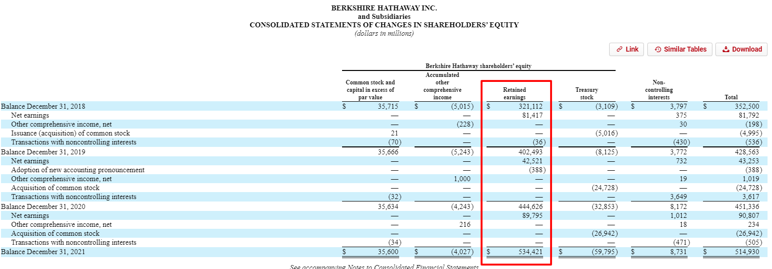 Let’s take a look at some actual statements of retained earnings. The first company we will take a look at is Berkshire Hathaway.