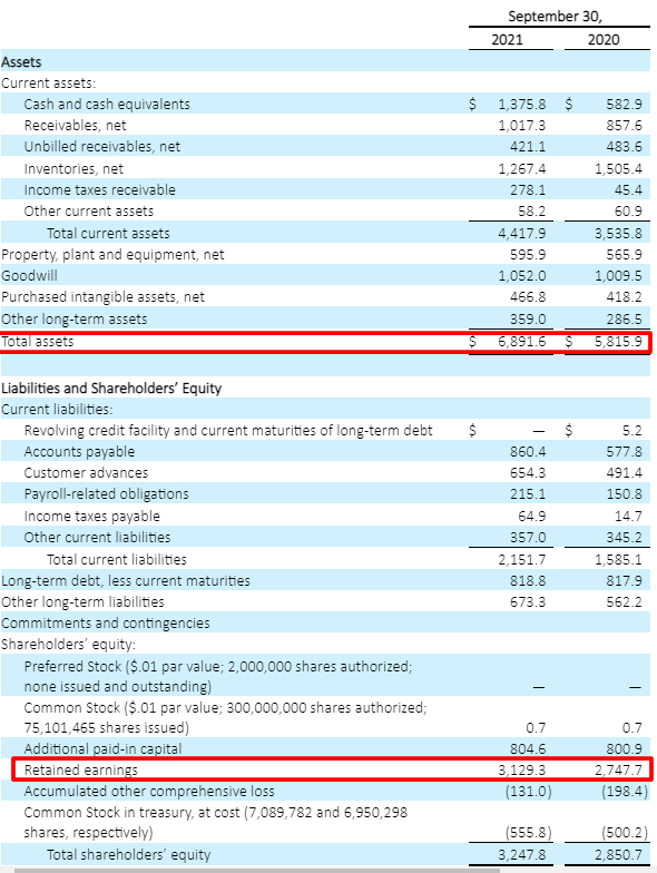 The retained earnings from the shareholder’s equity section are $3,129.3 million, and the total assets from the top of the balance sheet equal $6,891.6 million