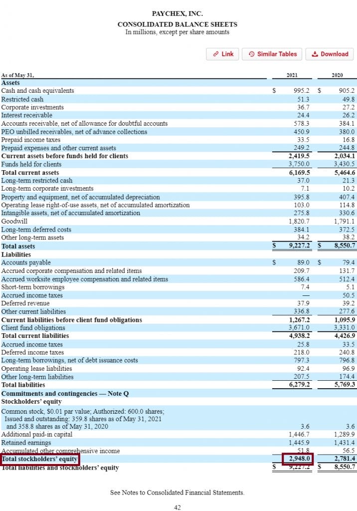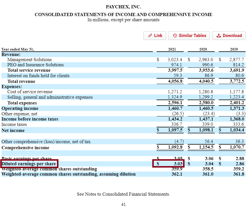 Let’s go to their income statement to find EPS (Earnings Per Share) and Dividends paid. I like using BamSEC for quickly finding a company’s 10-k, here’s from PAYX’s: